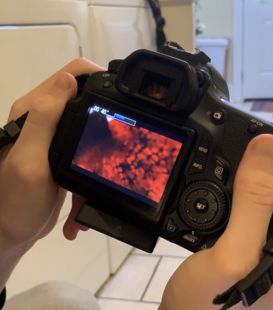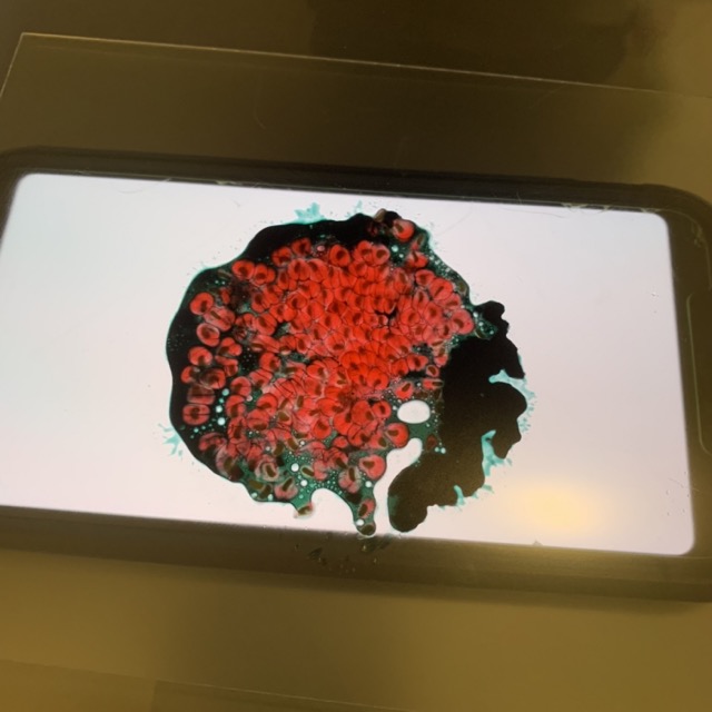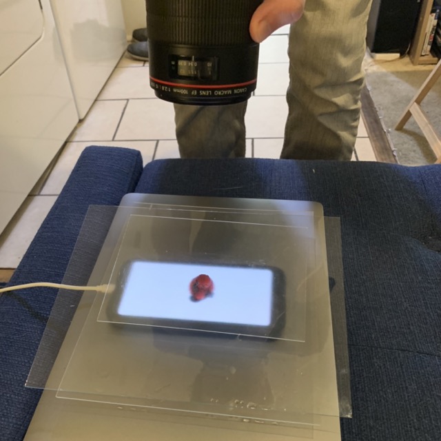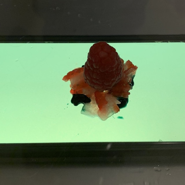 Raspberry stuffed with black gel and cut up strawberries on a phone screen.